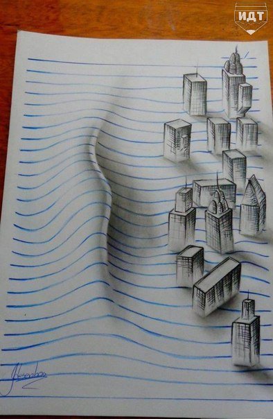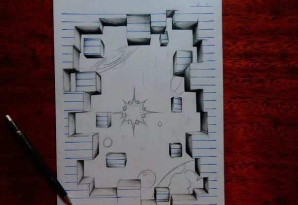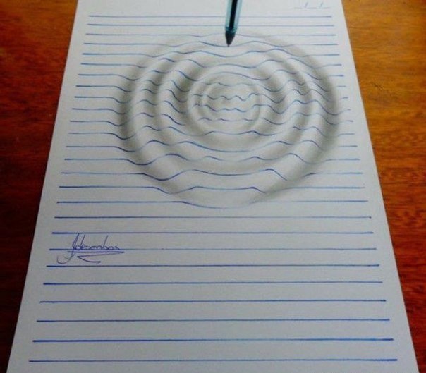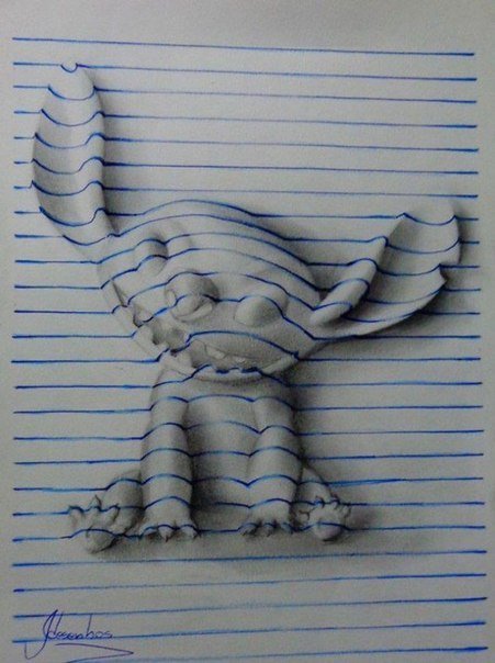 3D рисунки художника J Desenho. Художник Жоао Карвалью, известный под ником J Desenho, рисует оригинальные 3D рисунки, которые "выпрыгивают" из тетради в линейку. Чтобы придать иллюстрации эффект глубины, он каждую линию вырисовывает вручную, а затем заштриховывает нужные элементы карандашом.